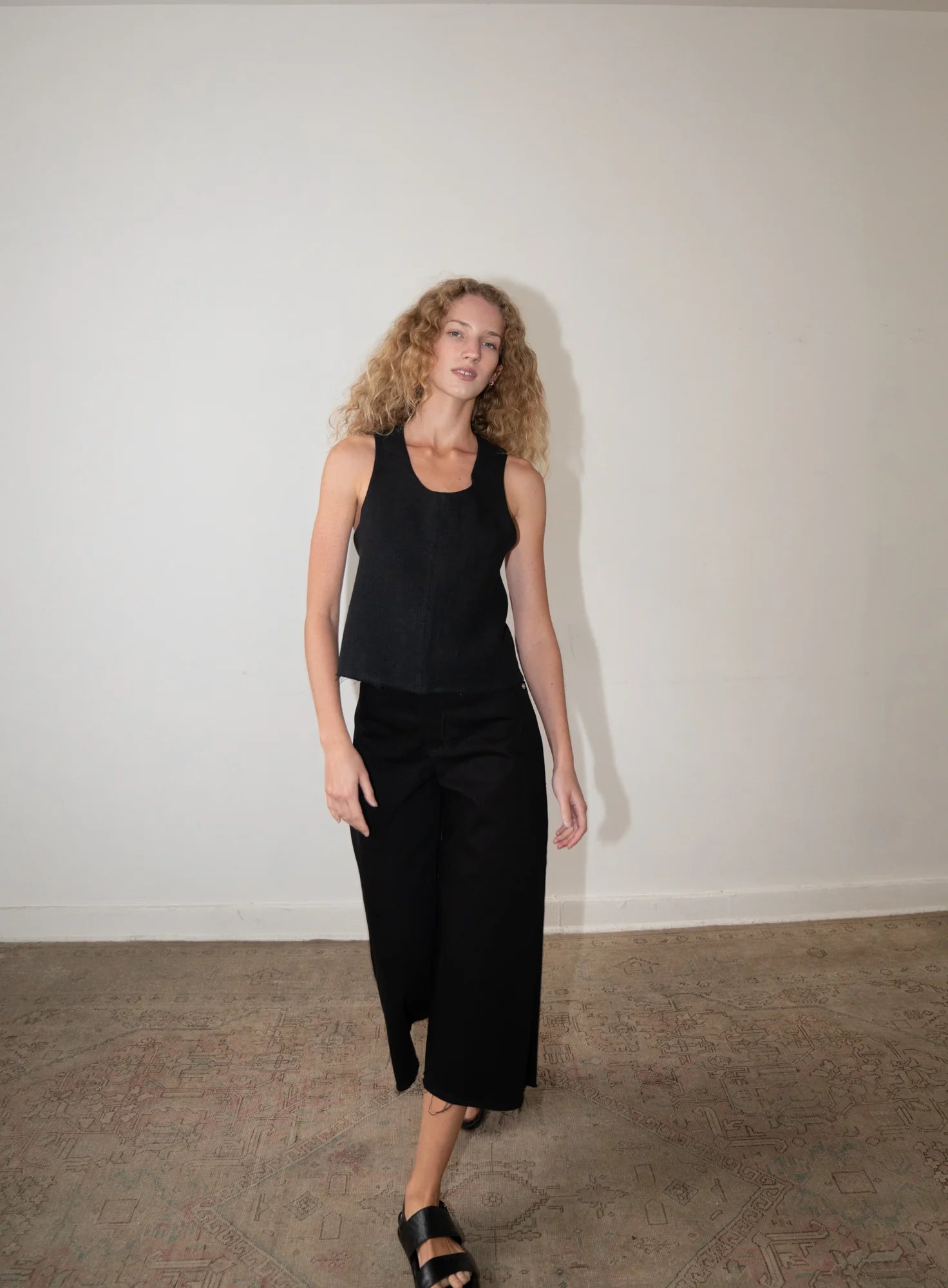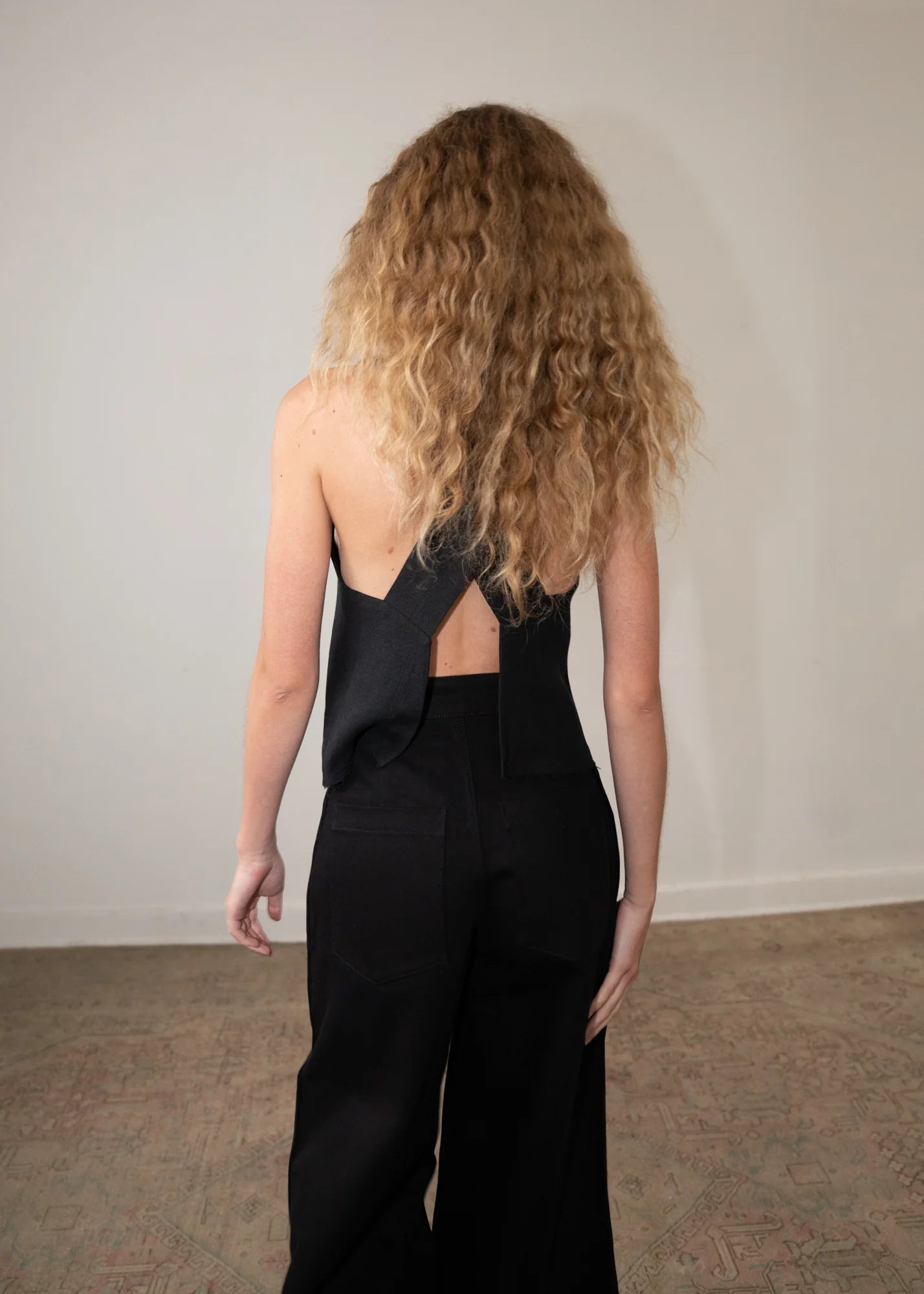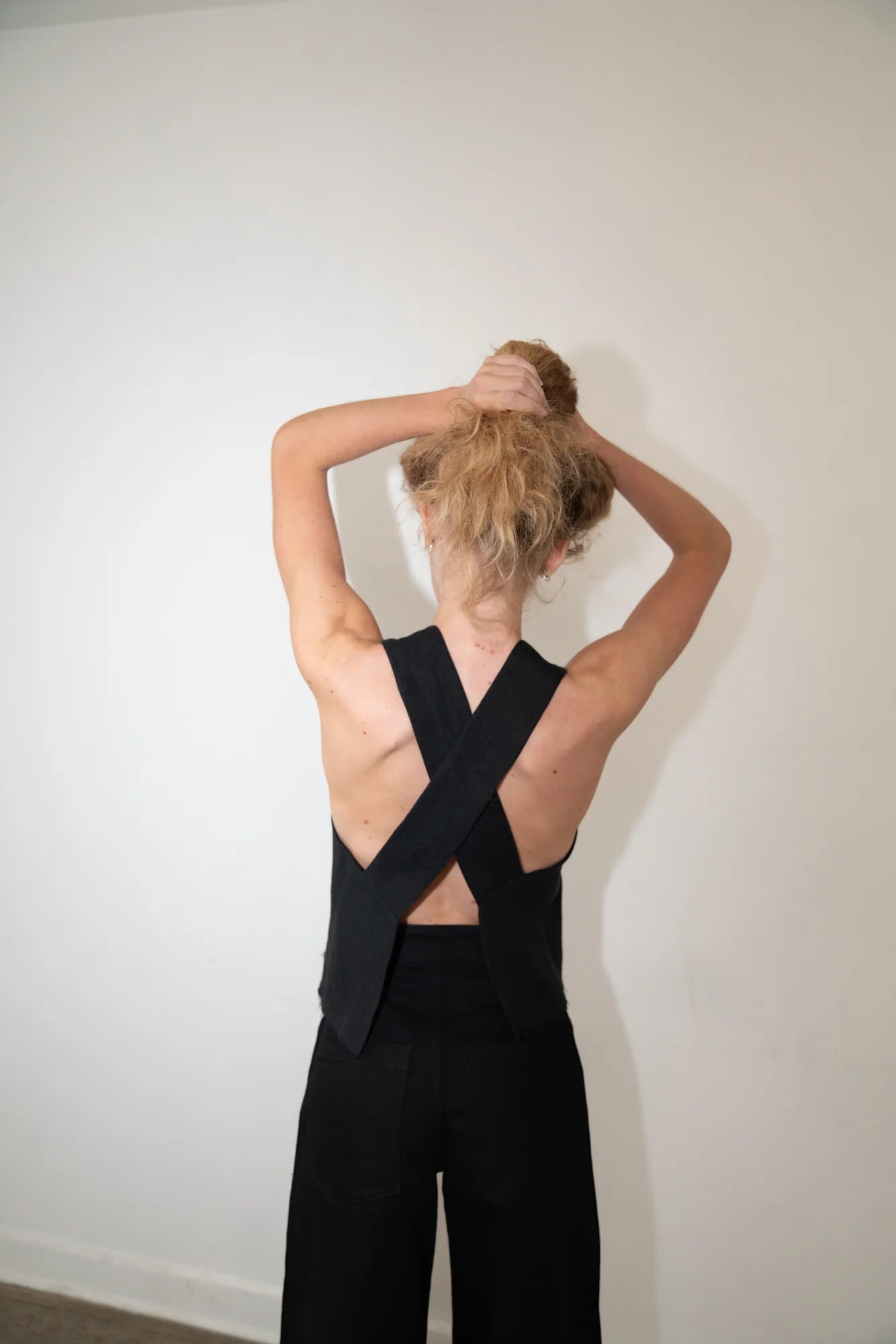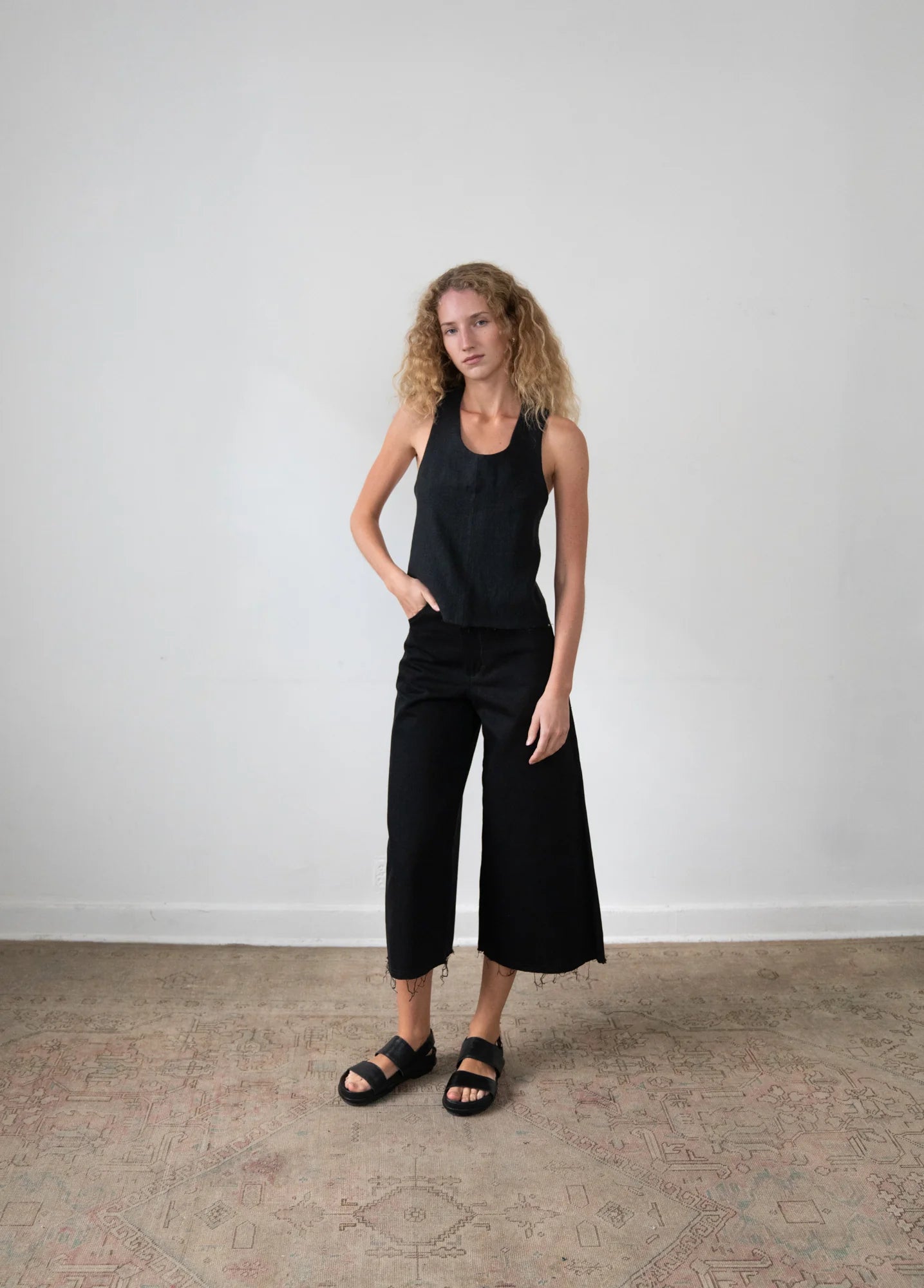 The AKU top, from the CLASSICS Collection, is a wide strap tank with a criss-cross, open-back detail. The linen fabric is doubled for a perfect drape and this is the newest version with a finished hem.