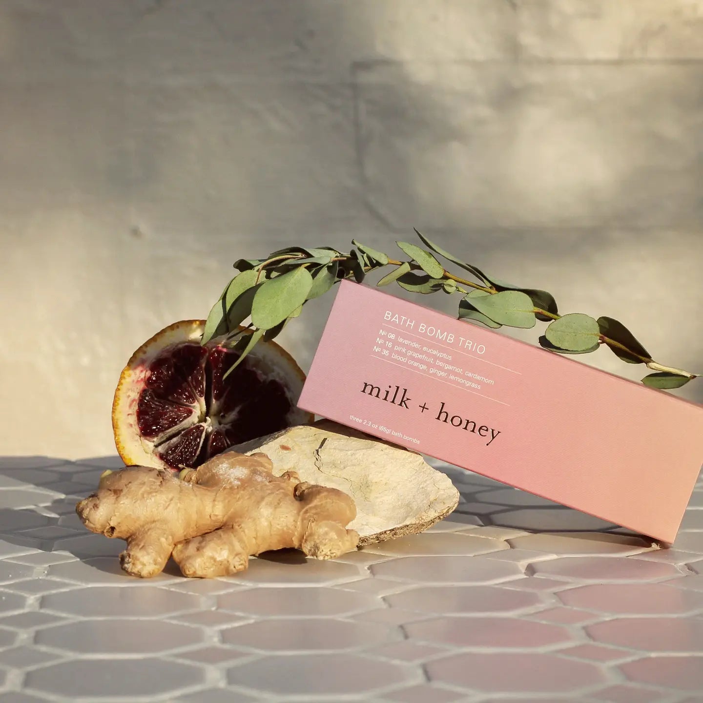 DELIGHT AND INDULGE in your next bath with our small-but-mighty bath bombs. Each one is infused with pure aromatherapeutic essential oils to soothe your skin and calm the mind, while mineral-rich sea salt gently detoxifies and rebalances the body. No 08 | Lavender, Eucalyptus. Calms the senses and eases tension. No 16 | Pink Grapefruit, Bergamot, Cardamom. Energizes and uplifts the spirit. No 35 | Blood Orange A natural antiseptic that moisturizes the skin. Organic Ginger Calms inflammation and keeps skin healthy. Organic Lemongrass Invigorates the senses while eliminating bacteria. KEY INGREDIENTS: Organic Sunflower Seed Oil Keeps skin soft, healthy, and smooth. Sundried Sea Salt Heals, detoxifies, and draws impurities out of the body through the skin. INCLUDES ONE OF EACH SCENT (2.3OZ EACH)