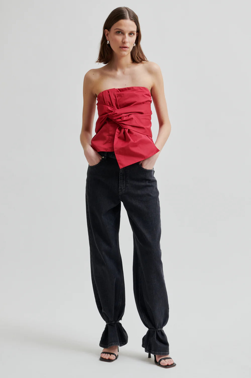 Strapless bow top. The top is made in a soft, smooth cotton blend. Featuring A side zip fastening and elasticated section at the back. Large bow detail at the front. Non-slip silicone lining inside bust. Slim fit.