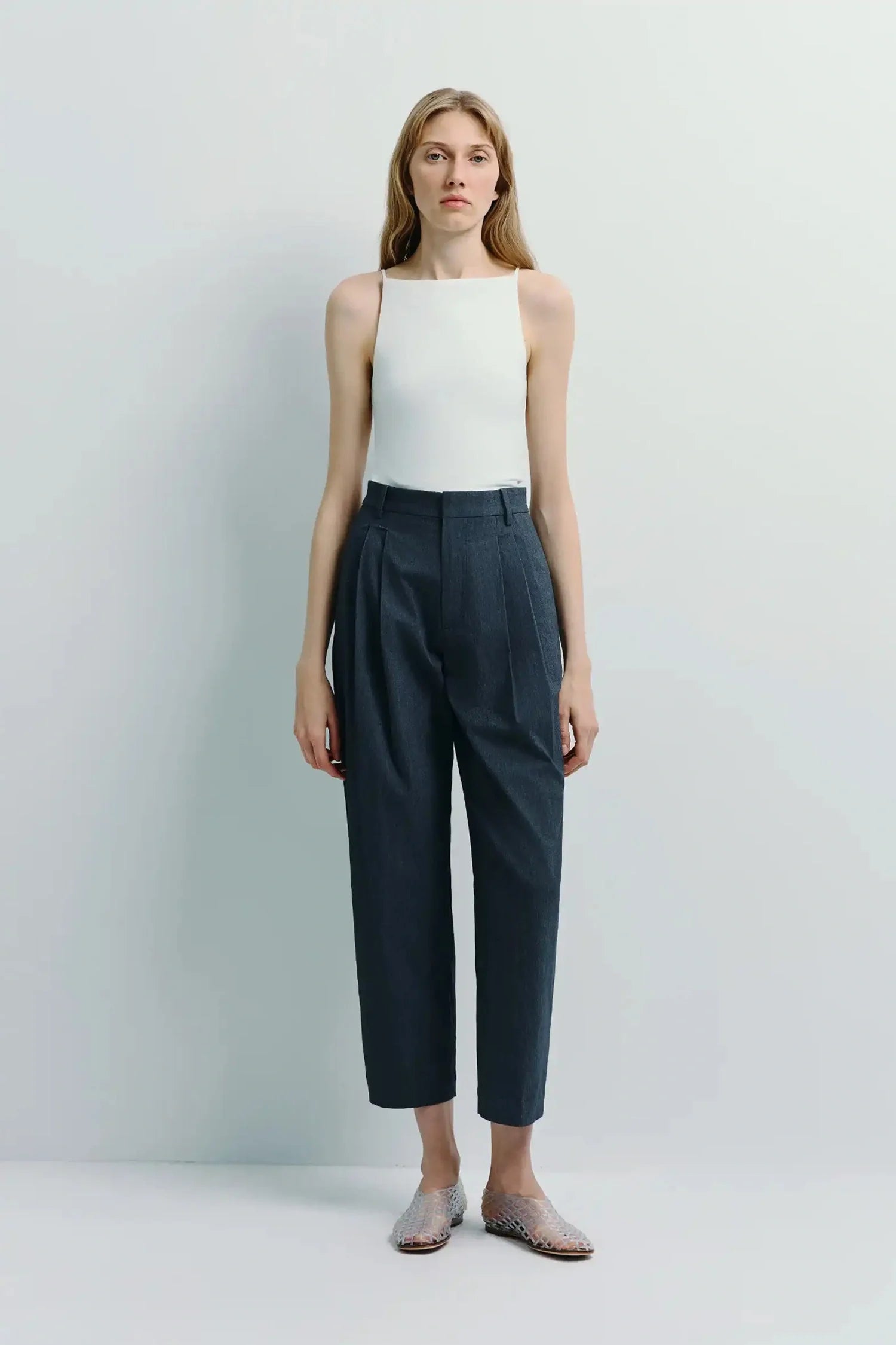 Tailored from soft cotton twill, this high-waisted pant features crisp front pleats and a tapered leg for a structured yet relaxed silhouette.