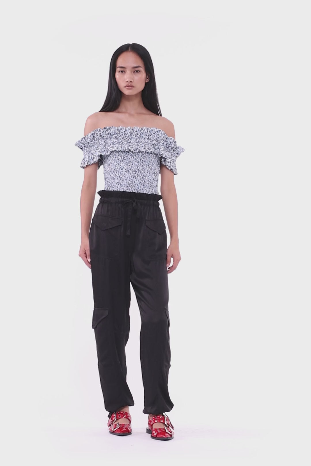 This Cotton Poplin Off-shoulder Smock Top is made from organic cotton. The top is designed for a form-fitting silhouette and features a ruffled off-shoulder neckline, smock bodice and a flounce hem.
