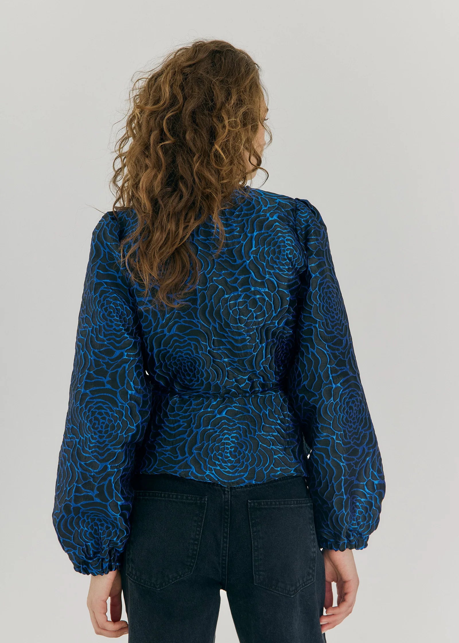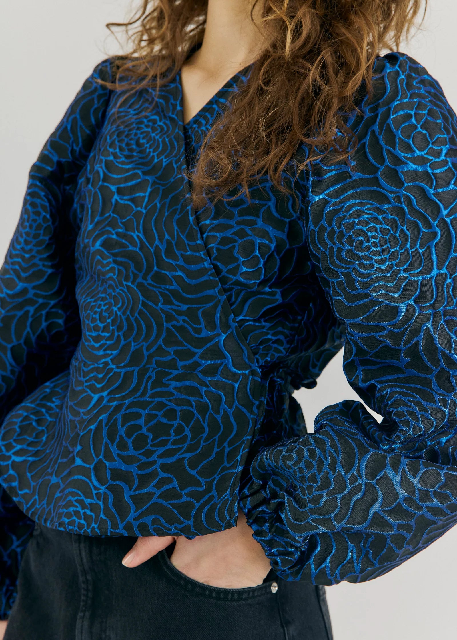 A feminine wrap-style top with soft texture and subtle shimmer. Designed with voluminous sleeves and a flattering neckline — perfect for dressing up or down.