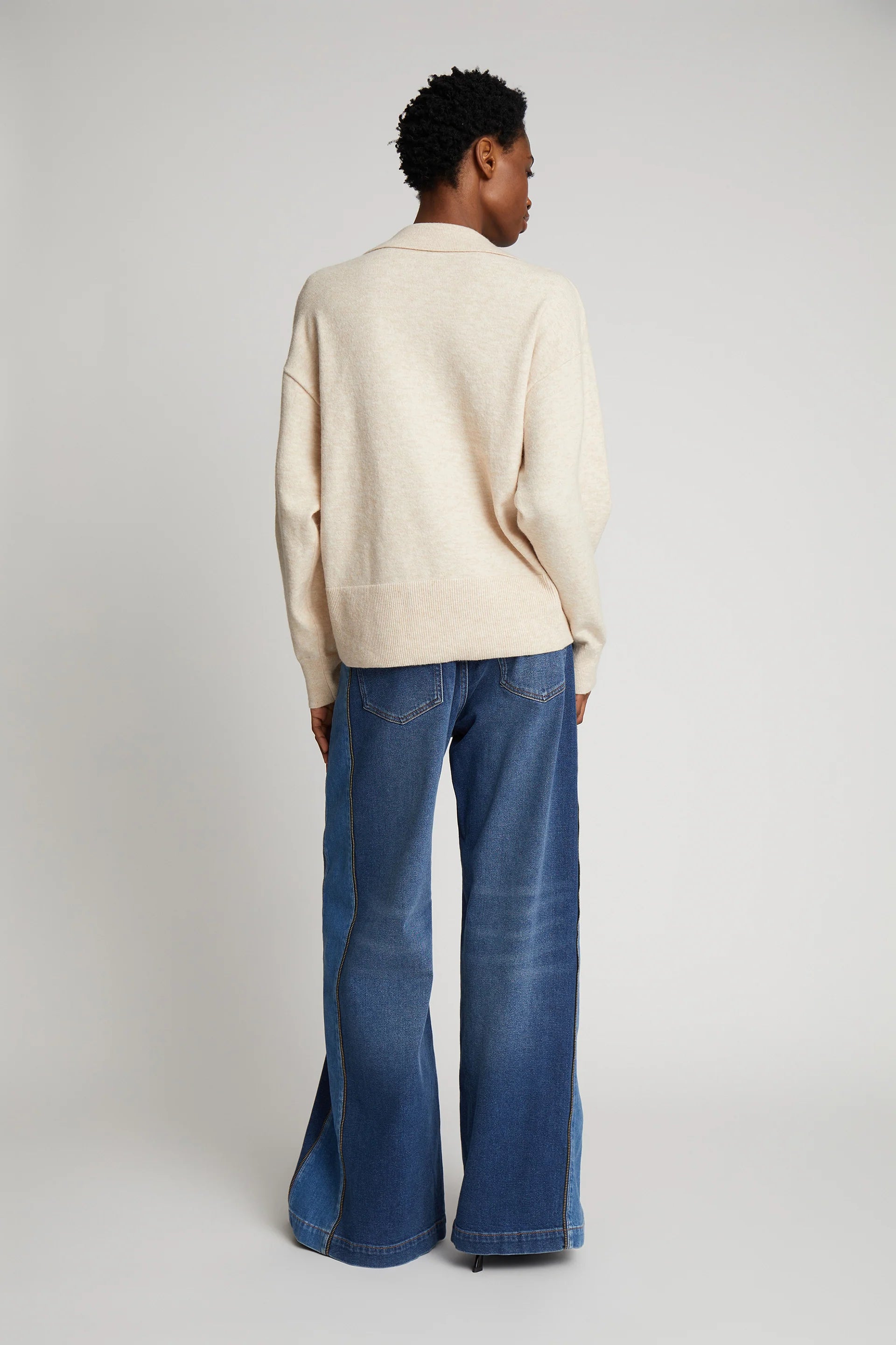 Knit with an elegant polo neck and a wide rib at the end of each sleeve, and at the bottom of the knit. The knit is made from a soft wool blend and designed for a loose fit.