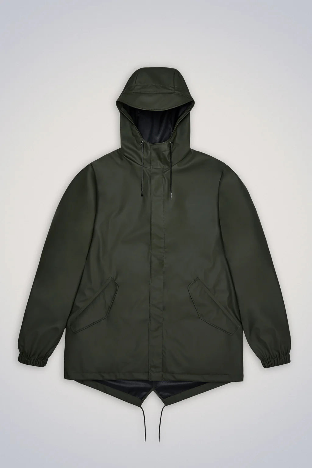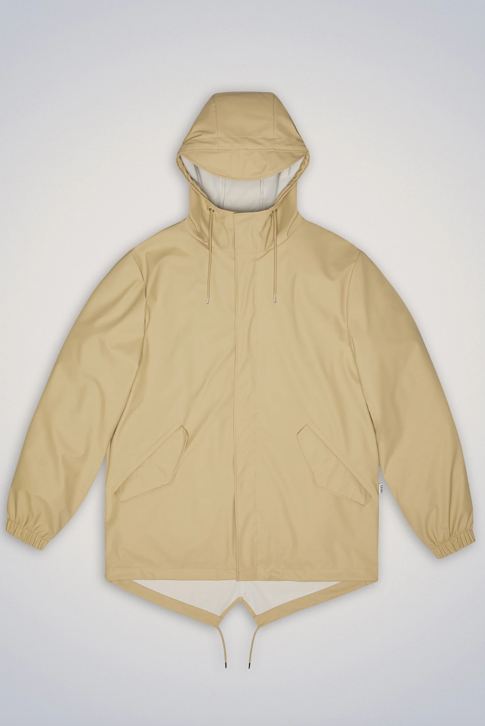 Fishtail Jacket is a unisex raincoat characterized by its pared-back aesthetic and drawstring fishtail hem. The design has a casual fit with a sloping hem. The full-length zip closure is concealed by a minimal snap-fastened placket with concealed snap fastenings. Fishtail Jacket features utility-inspired pockets, elasticated cuffs, vented back yoke, and a drawstring hood with signature built-in cap.