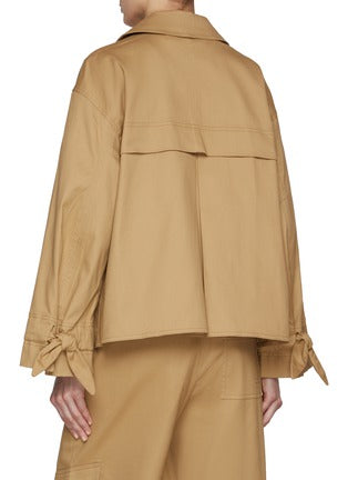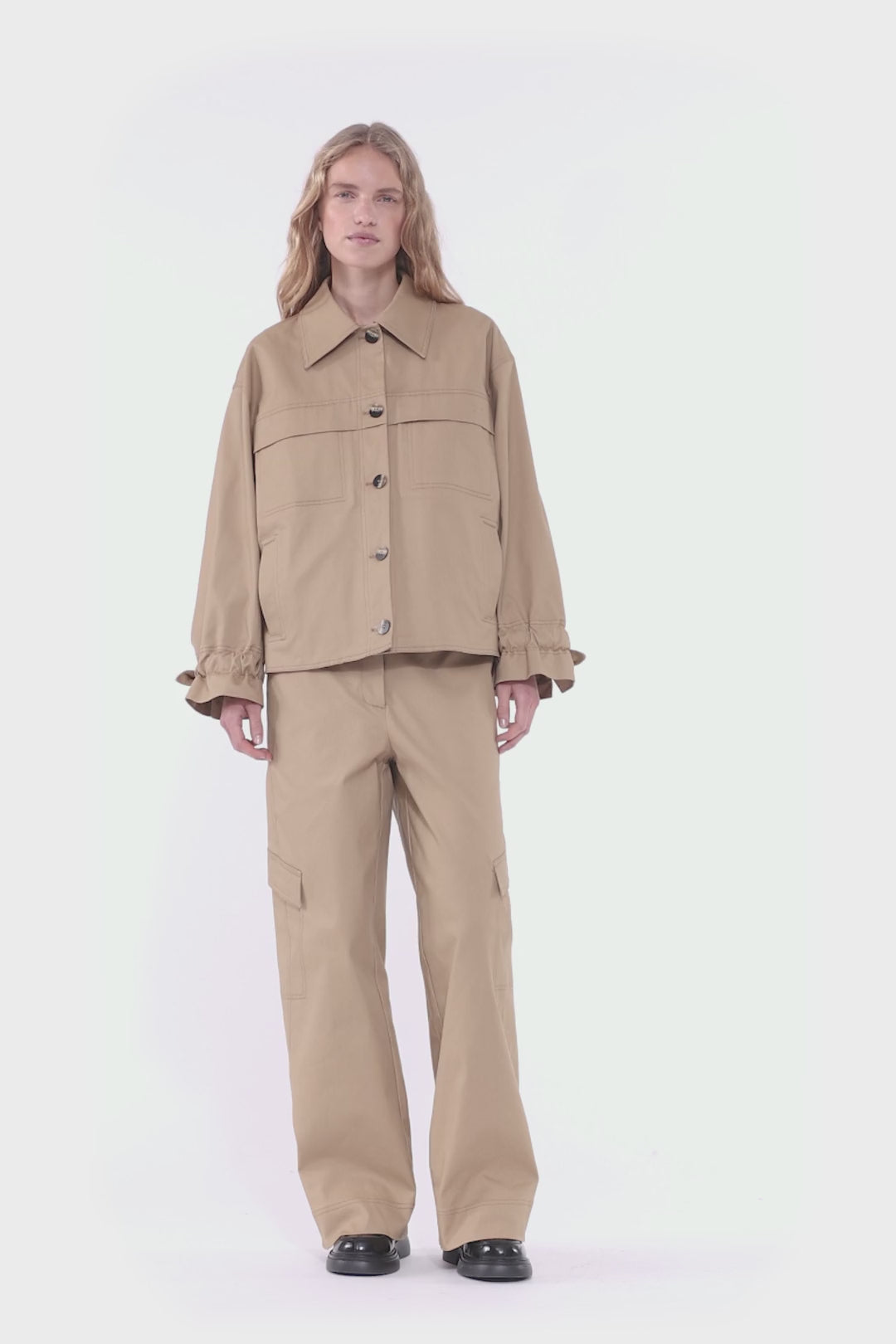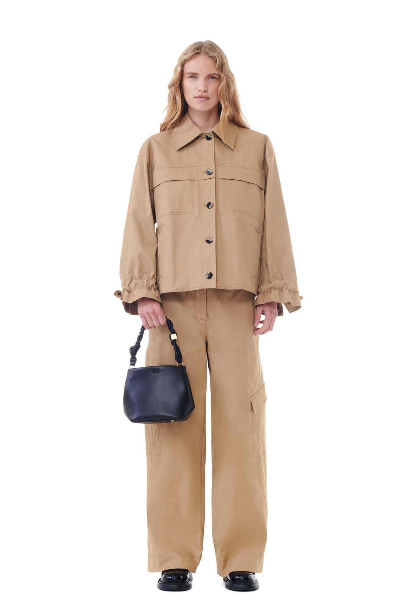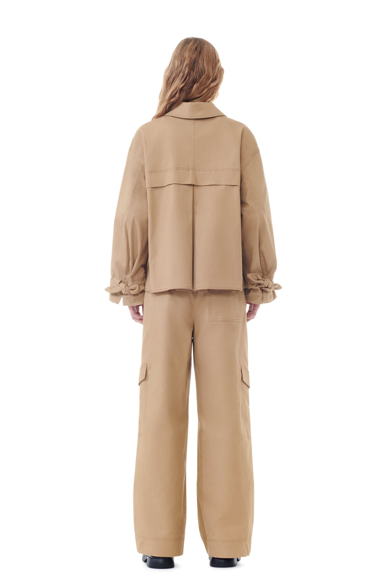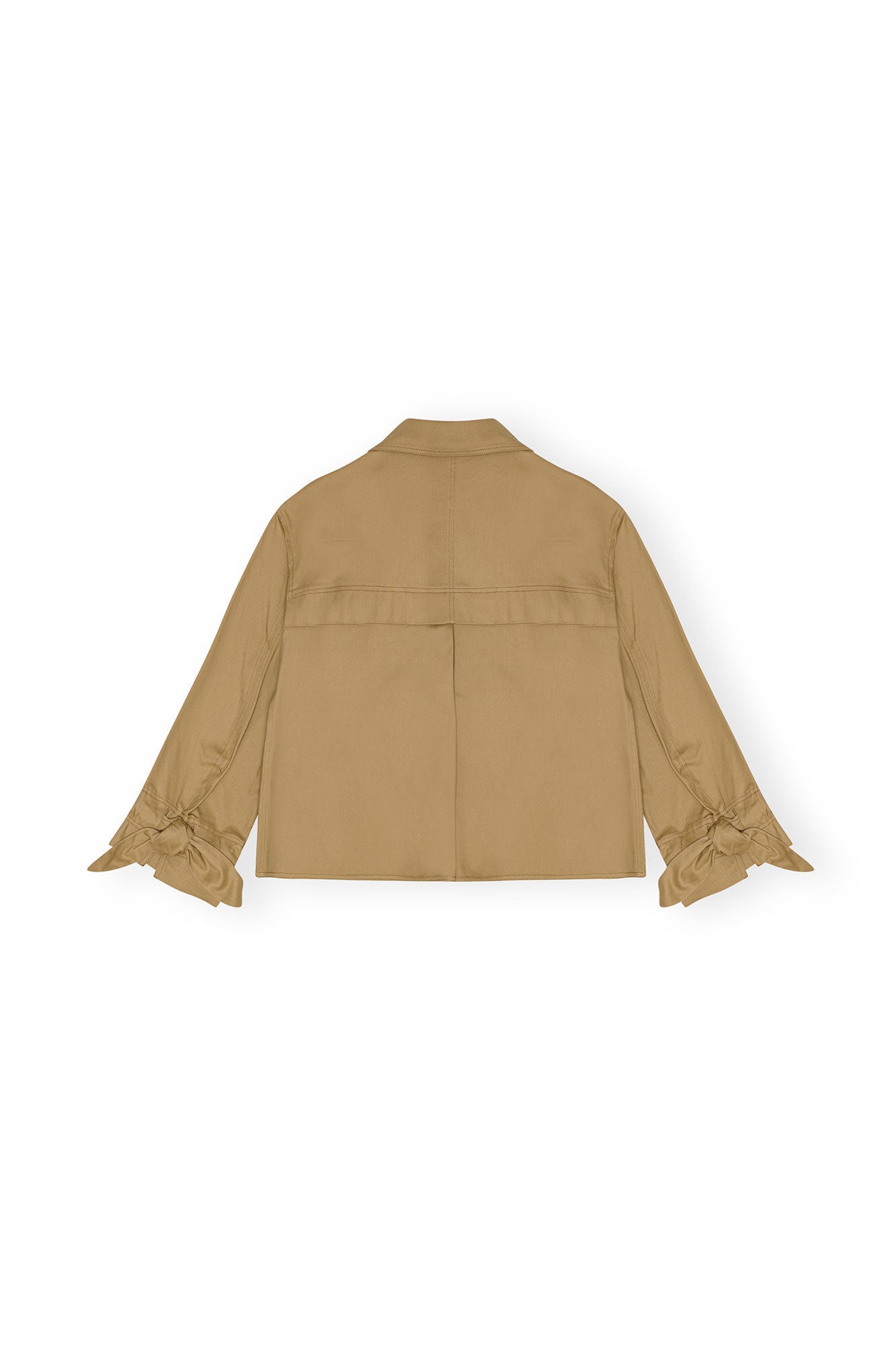 This Brown Herringbone Canvas Jacket features a collar, button closure at the front, side slit pockets and a knotted detail at the sleeves