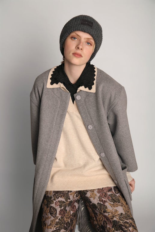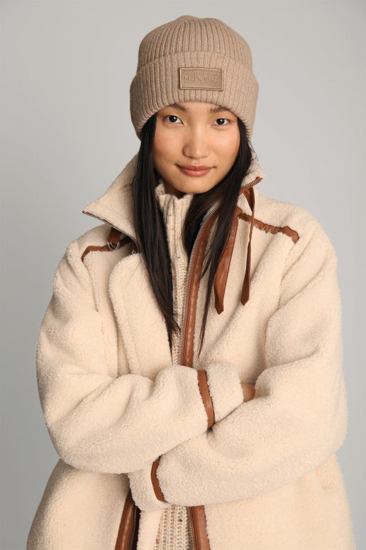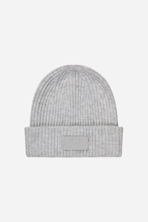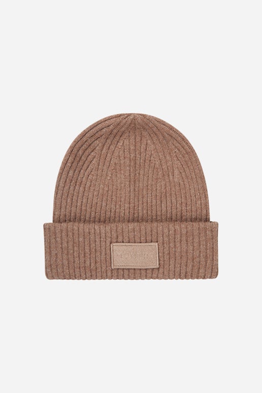 Ribbed knit beanie with a logo patch at the front. Made in a recycled polyester blend.