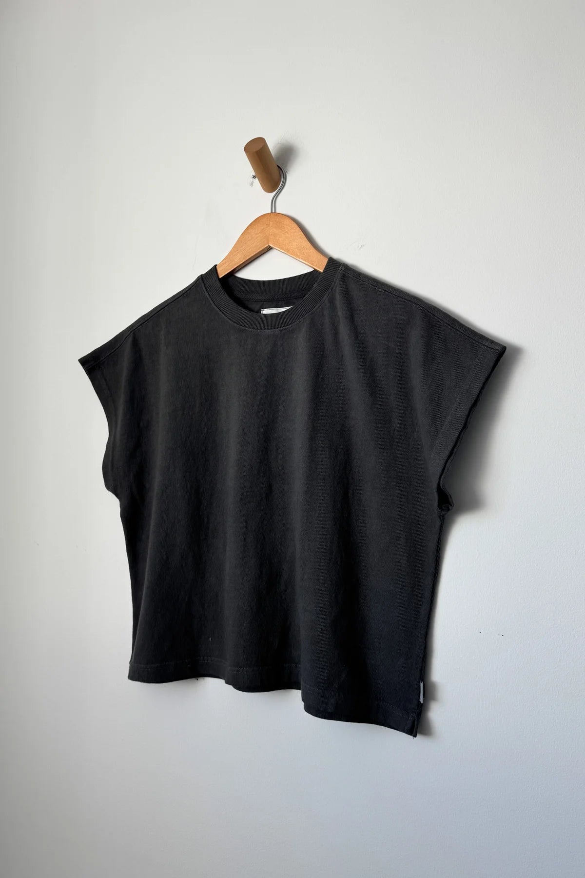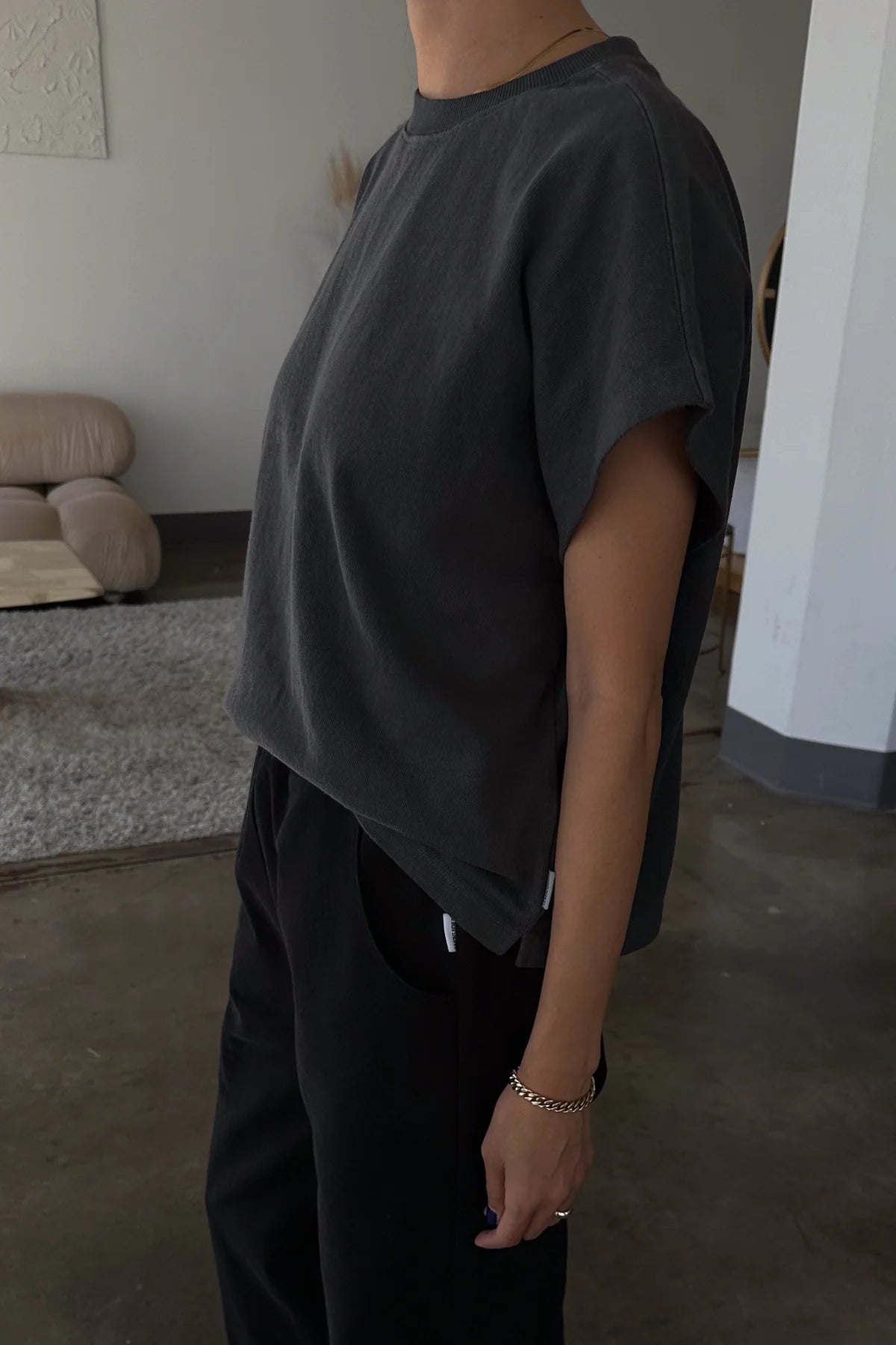 Jeanne tee is our perfect muscle tee. She features a shorter length to pair perfectly with high waisted bottoms but still give enough coverage for mid-rise bottoms and just the right amount of off shoulder dolman sleeve. She has a high crew neck with an extra wide neckband that adds to her signature charm.