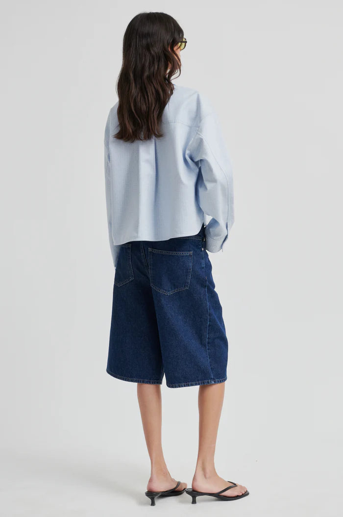 Cropped shirt with micro dots. The shirt is made in a cotton blend with woven micro dot pattern. Featuring a regular collar and button fastening. Large chest pocket and long sleeves with adjustable buttoned cuffs. Wide, cropped fit.
