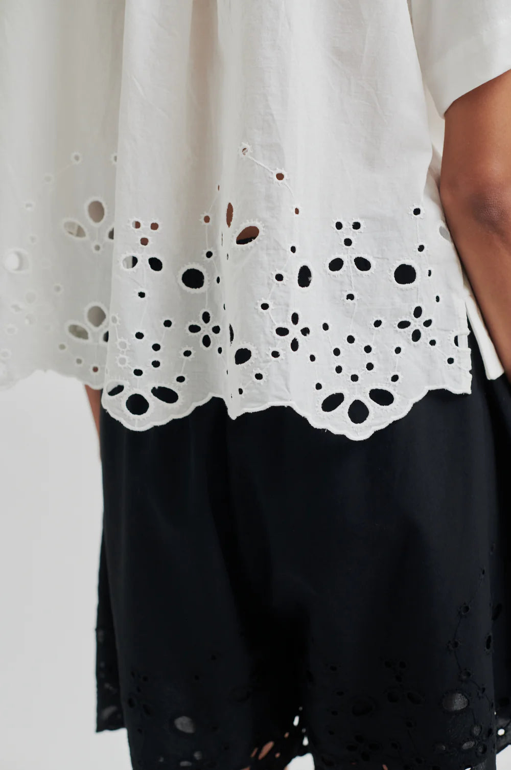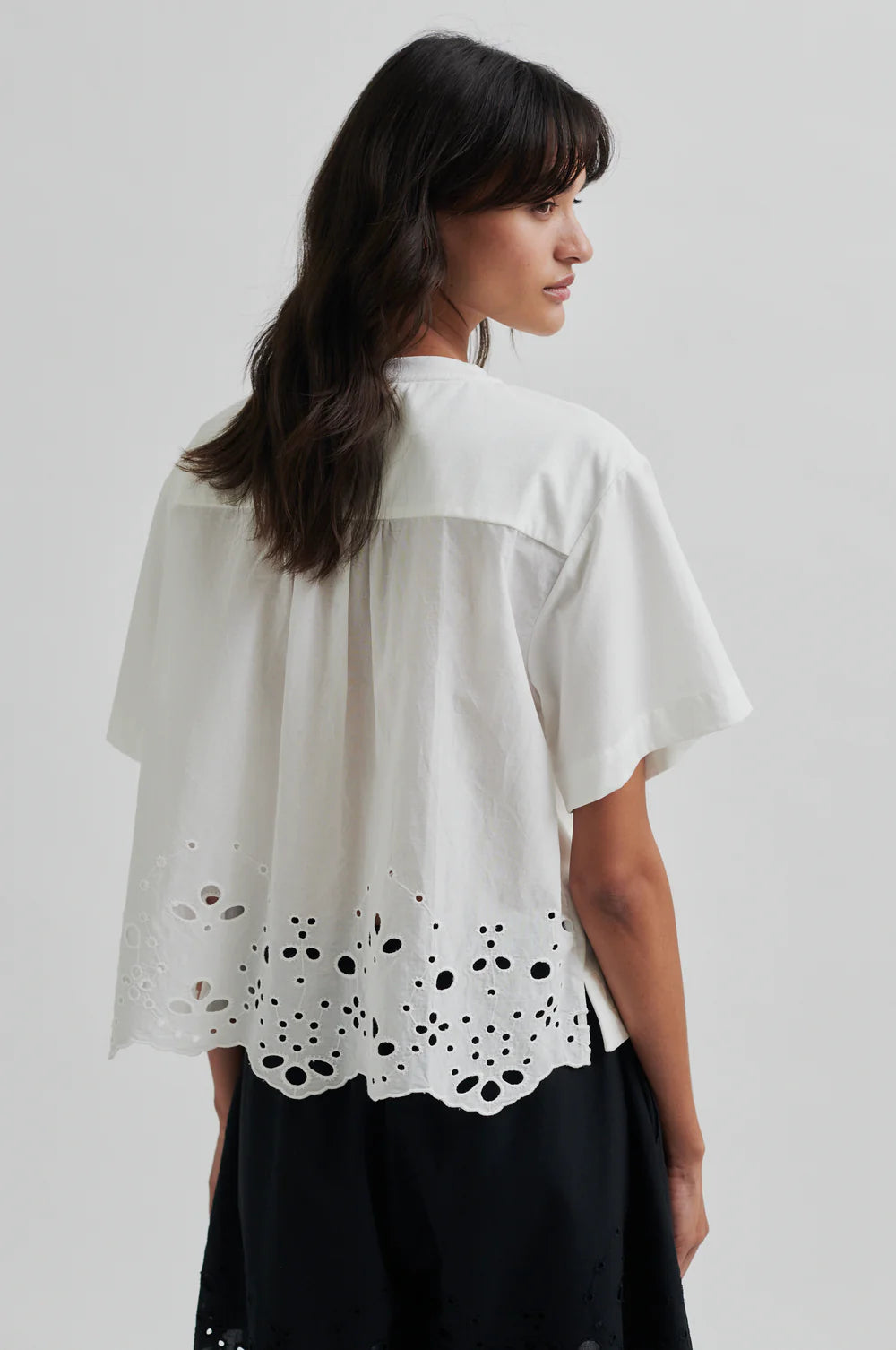 Second Female t-shirt with broderie anglaise. The t-shirt is made in light and soft cotton jersey with broderie anglaise panel at the back. Featuring a round neck and short sleeves. Scalloped hem at the back. Loose, relaxed fit.