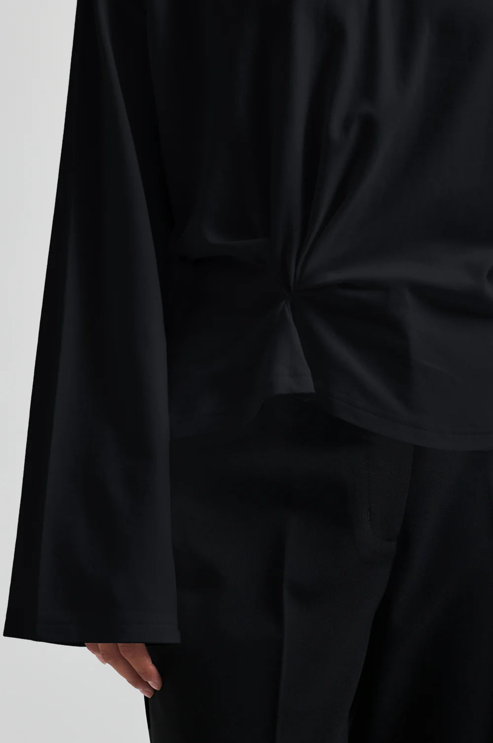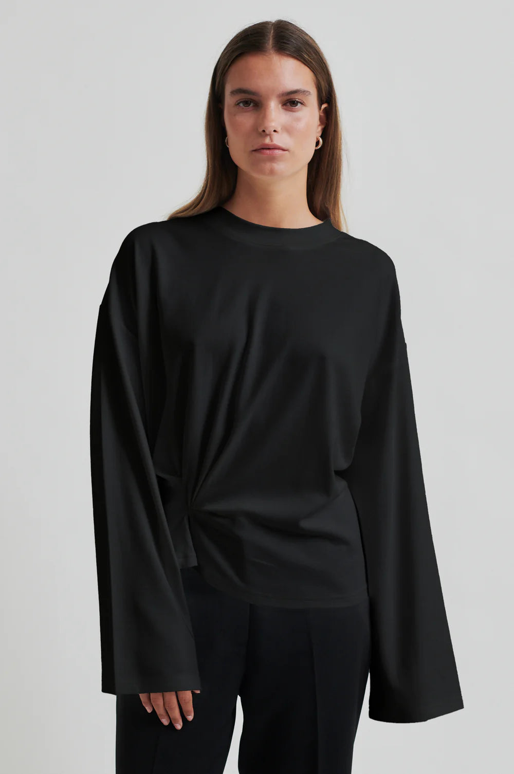 Gathered long-sleeved tee. The t-shirt is made in a soft and stretchy tencel-cotton blend. Featuring a round neckline and dropped shoulders with long sleeves. Gathered detail at front that creates draped effect. Relaxed fit at top with more fitted waist.