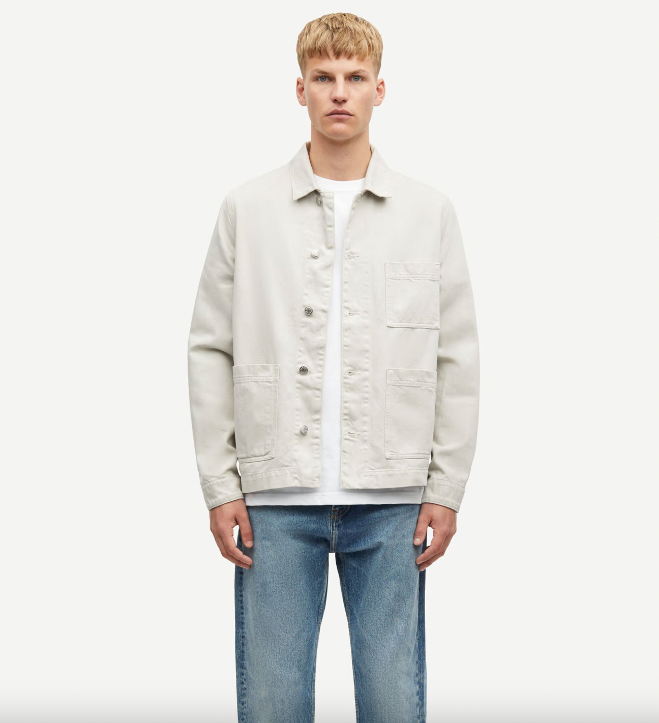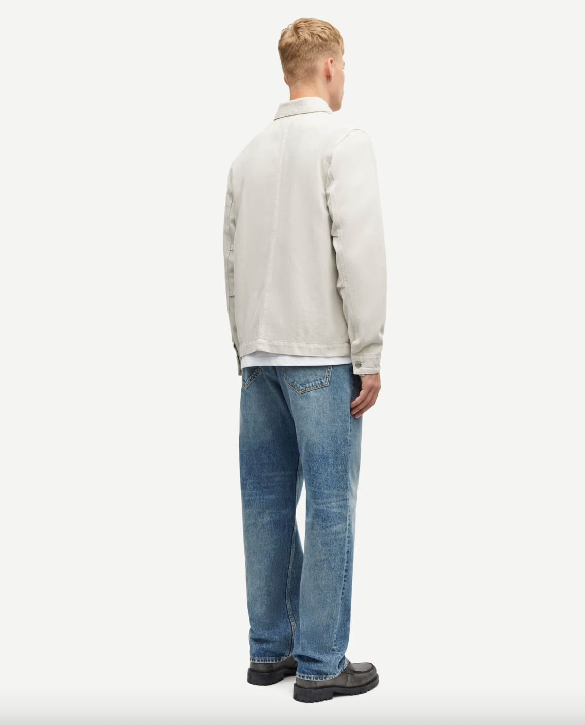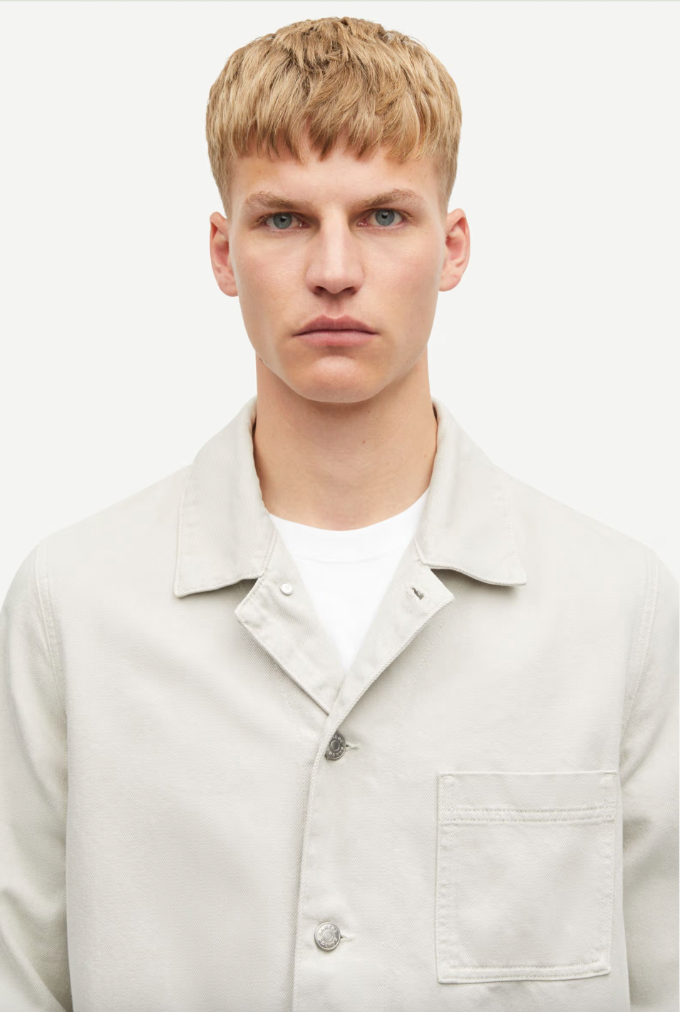 Denim worker jacket with a regular fit. Button closure on the front and buttoned cuffs. Samsøe Samsøe branded buttons. Patch pockets on the front. Main material made from 100% recycled cotton. This product is GRS certified. Each stage of the supply chain has met strict social, environmental, and chemical requirements.
