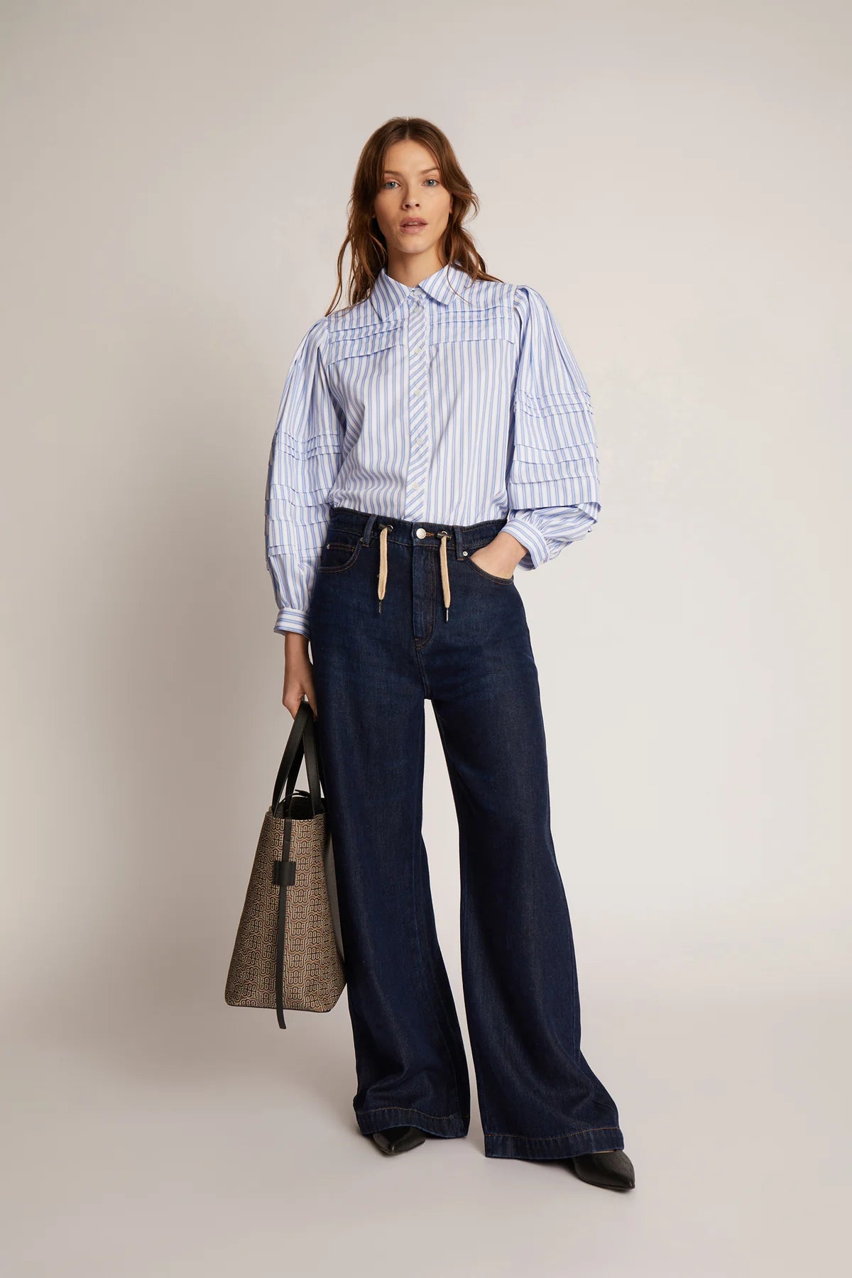 Dark blue jeans, designed with an elegant tie string detail at the waist. These pants have a loose fit, wide legs, and front and back pockets.