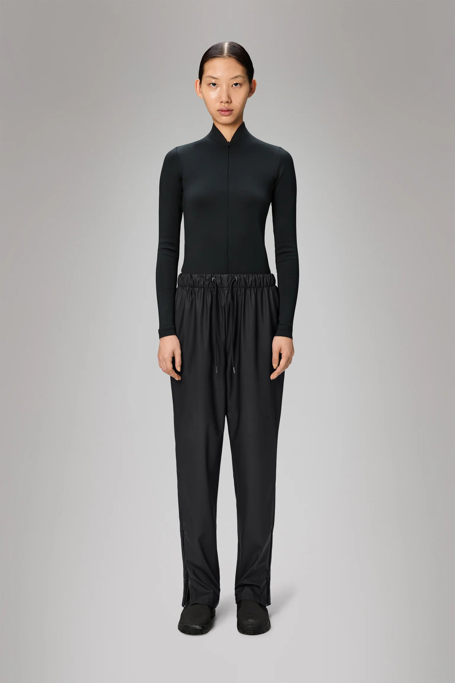 This clean and waterproof rain pant features elasticated waistband with drawstring and cuffs with tonal coated zips. Subtle accents include metal eyelets and drawstring tips.