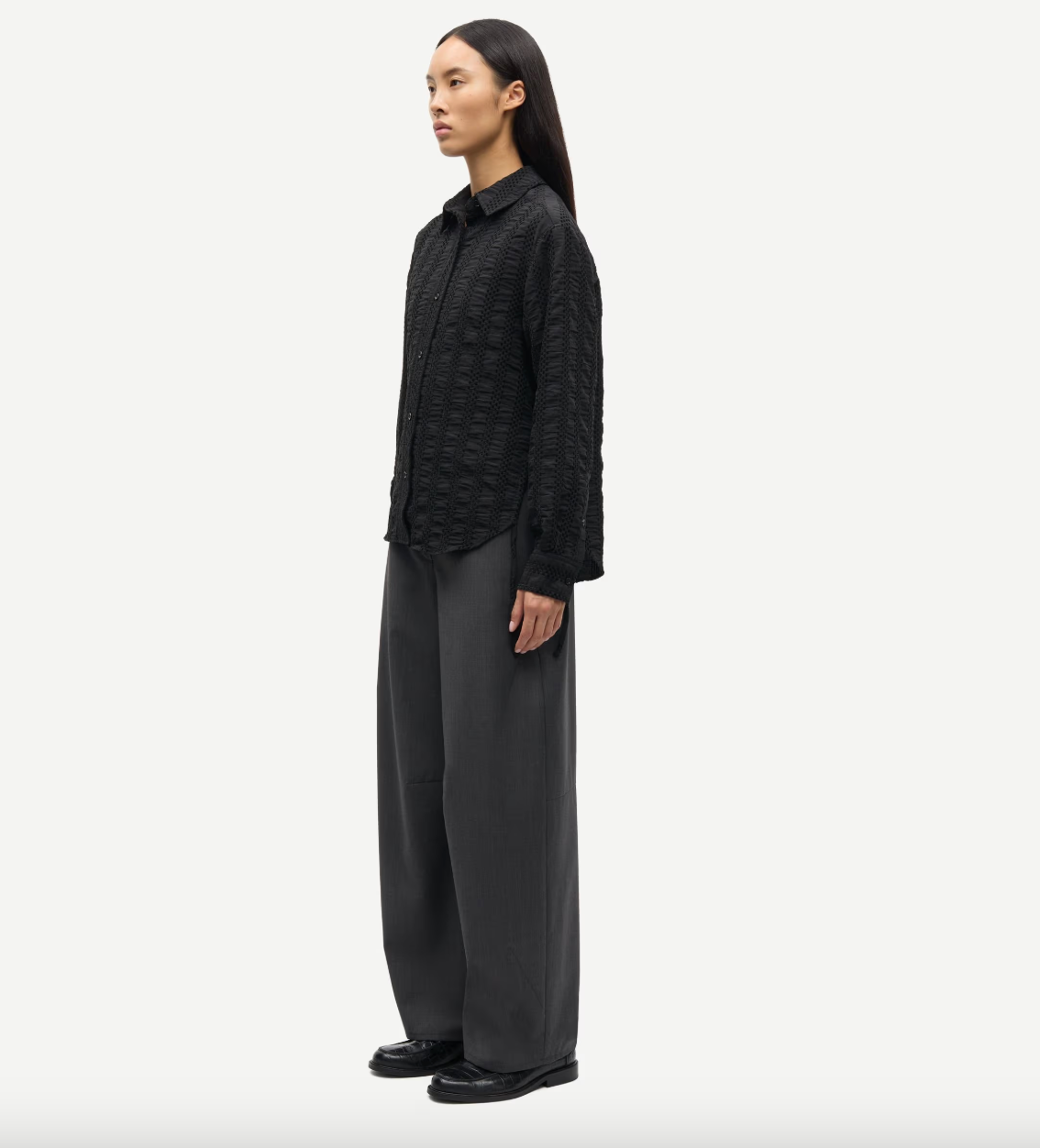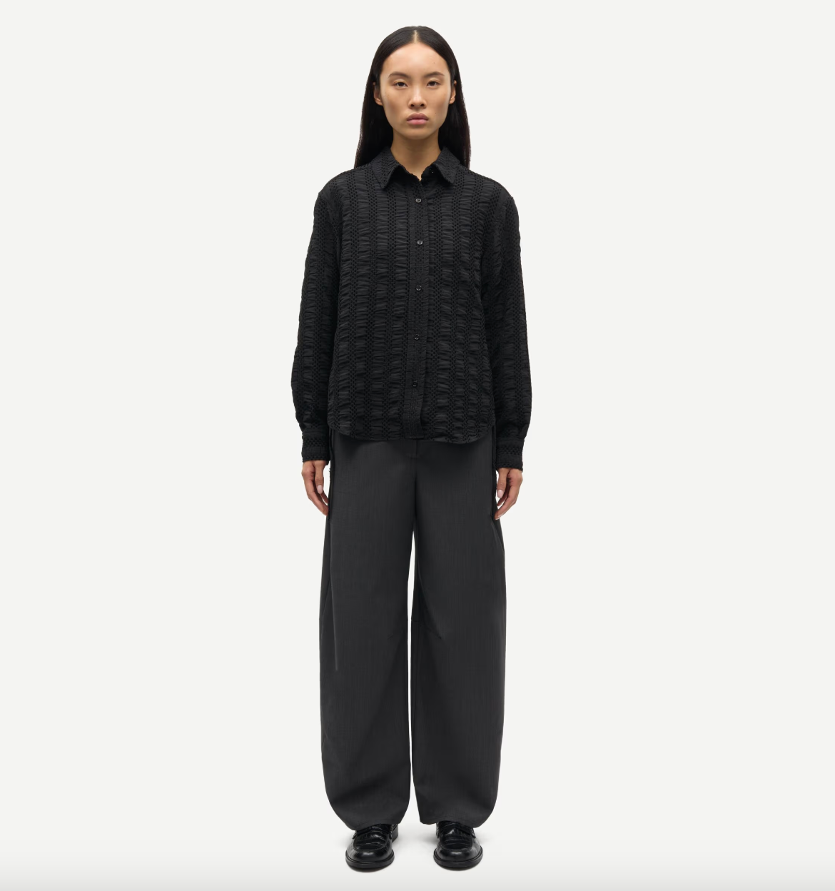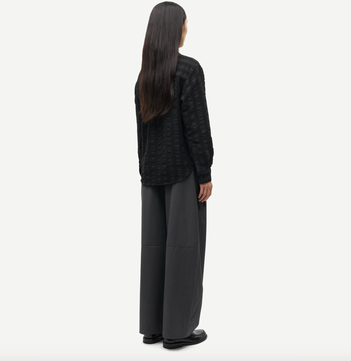 Long-sleeved shirt with a loose fit and dropped shoulders. Button closure on the front and buttoned cuffs. Neck yoke seam with a pleat. Straps at the hem for a gathered effect. Main material made from a blend of recycled polyester and recycled polyamide.