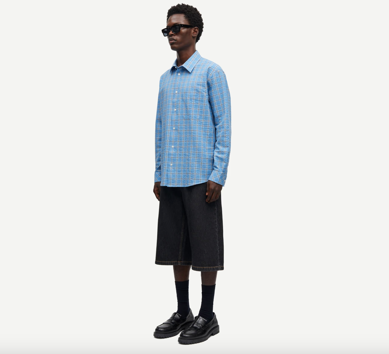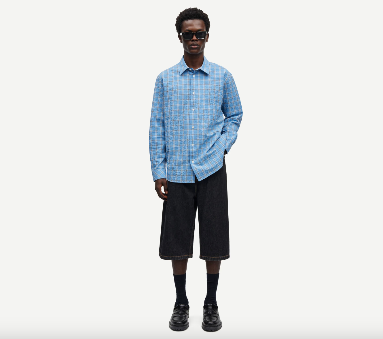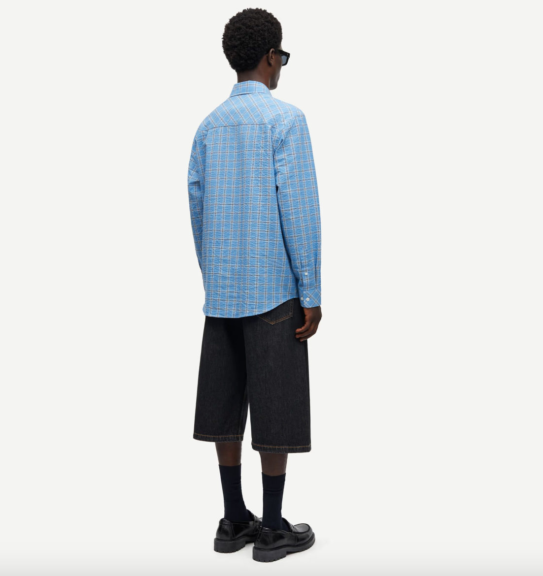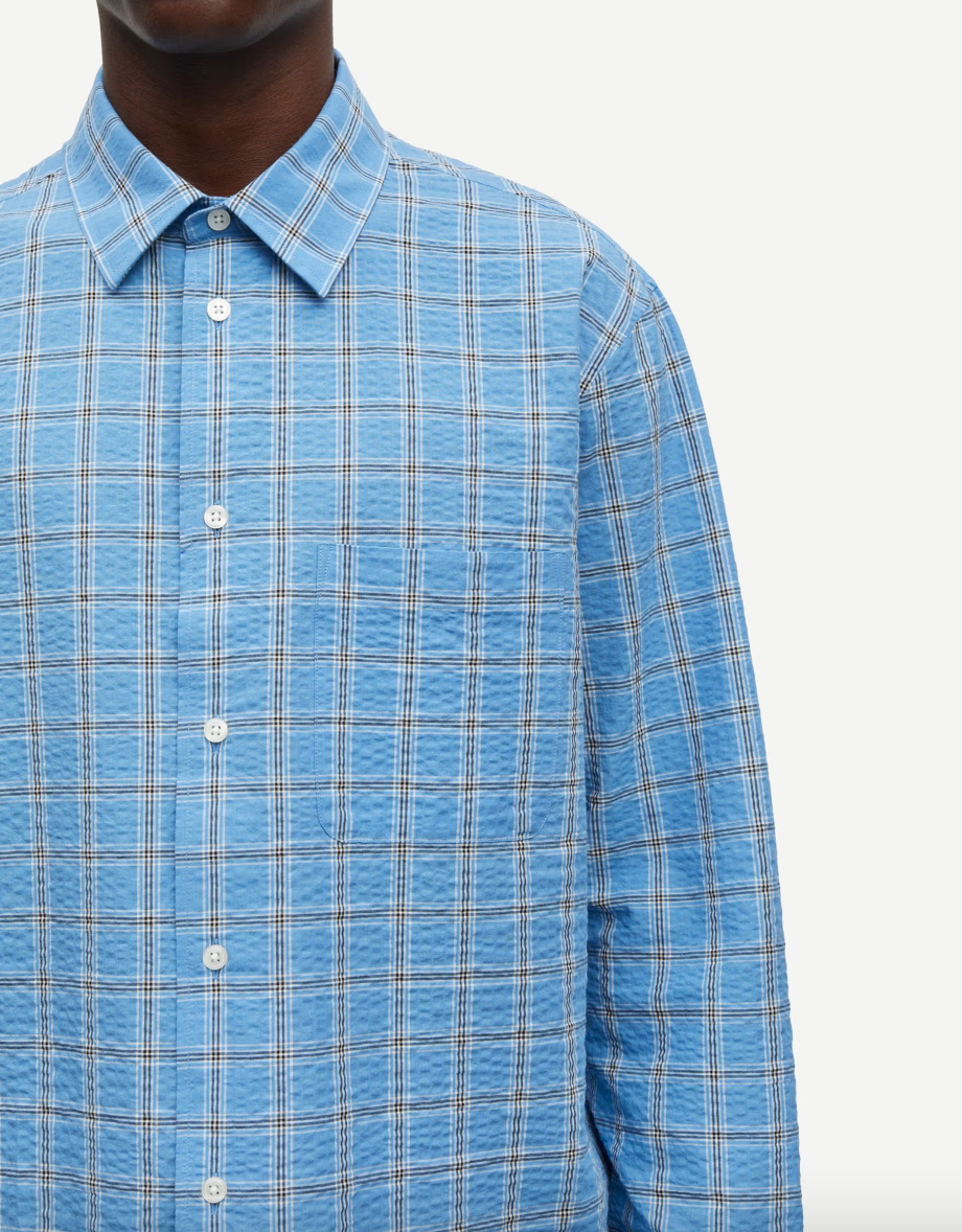 Long-sleeved checked shirt with a loose fit. Button closure on the front and buttoned cuffs. Single patch pocket on the chest. Neck yoke seam. Main material made from organic cotton.
