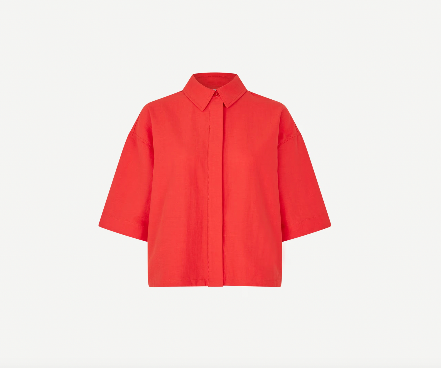 Short-sleeved shirt with a loose fit and dropped shoulder. Hidden button placket on the front and drawstring at the hem. Side slit pockets. Main material made from a blend including organic cotton and linen.