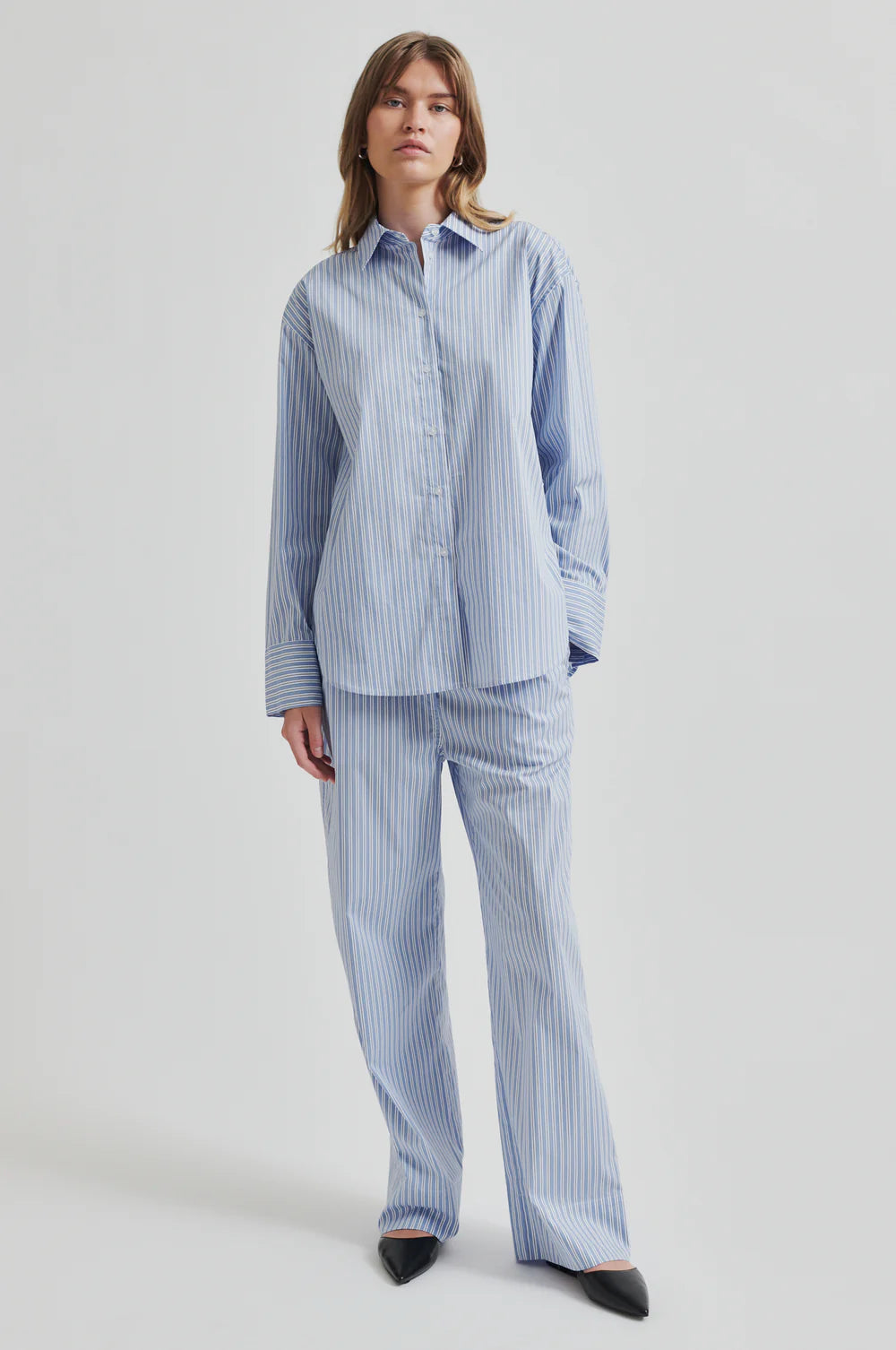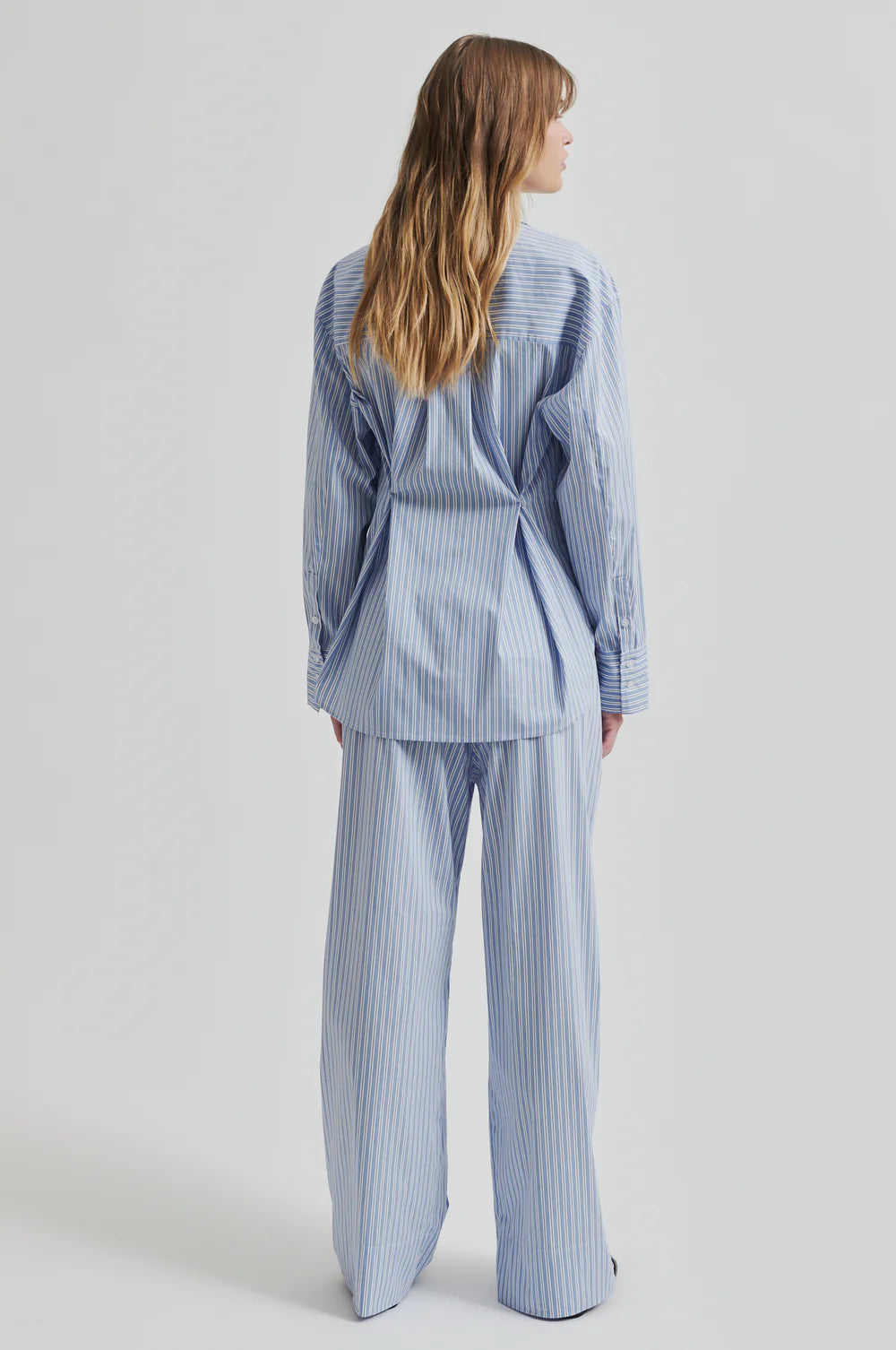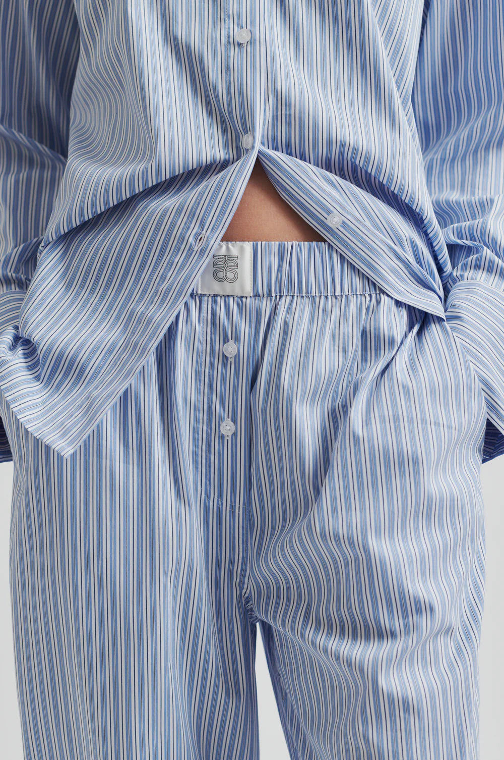 The trousers are made in a light and smooth cotton blend with all-over stripes. Featuring a covered elasticated waistband and decorative fly and button fastening with logo. Two slanted pockets at the front. Mid waist with relaxed, straight leg